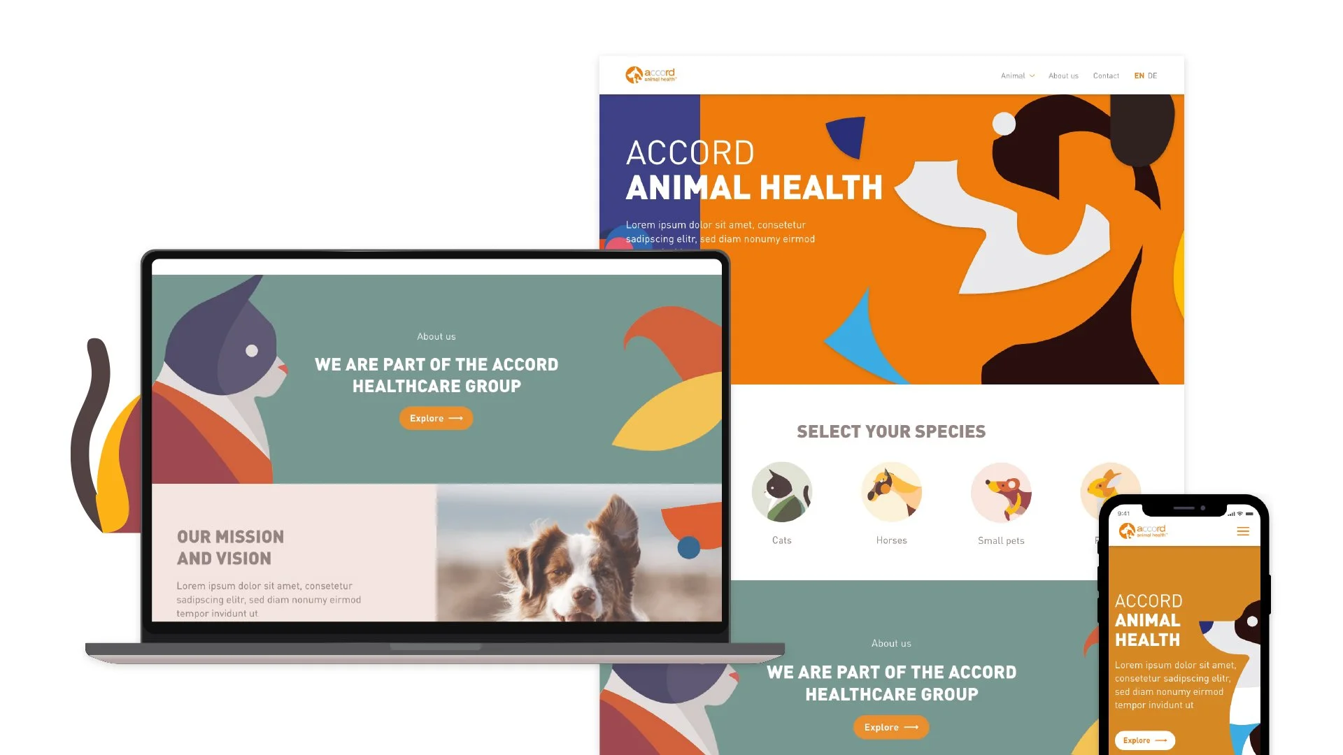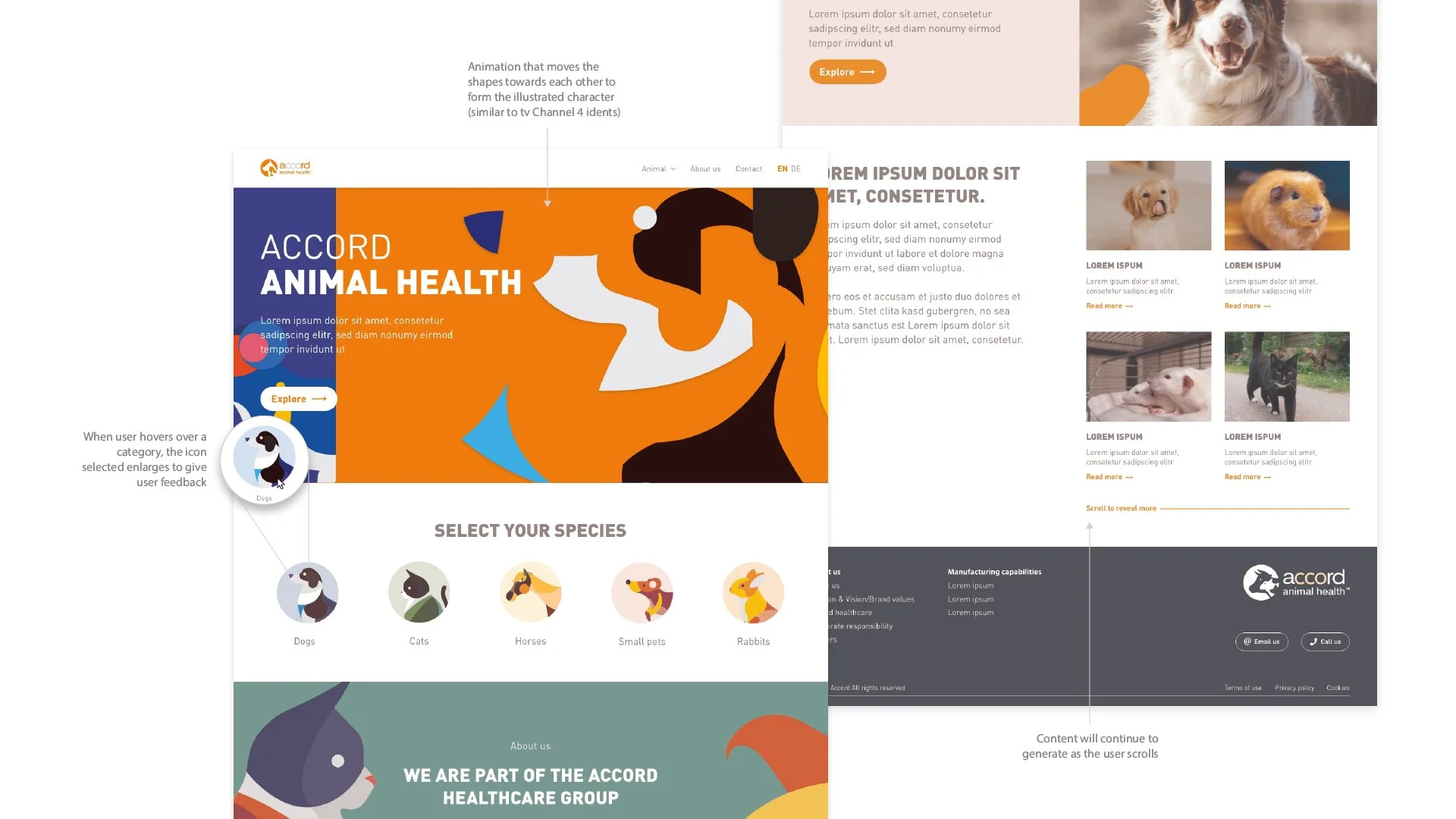 my initial process was to draw upon the existing animal health brand identity, to see what could be elaborated on or expanded in a digital design setting. settling on the use of iconographic illustrations and a fun, vibrant colour palette, i put together a layout for the website, based on site hierarchies that were supplied by the digital project manager.